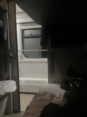 寝台のコンパートメントの様子。昨日乗ったモルドバ国鉄の旧ソ連車と構造は同じだが新しい車輌である。同室のウクライナ人と思われる女性はなかなか親切で上着をかける場所を教えてくれたりした。