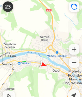 出発すると、川の向こう側にウクライナの明かりが見えている!モルドバ側は真っ暗でうっすらと見える街の雰囲気はどう見ても「発展途上国の田舎」。それに対して、川を渡ったあとのウクライナ側にはスーパーなども見え、そちら側の方が発展している様子が窺える。ちなみに、この川はドニエストル川の上流である。
