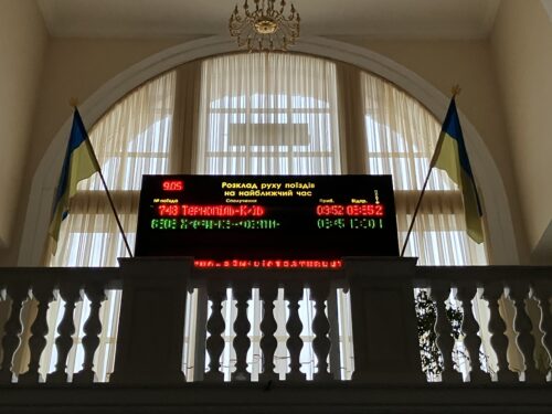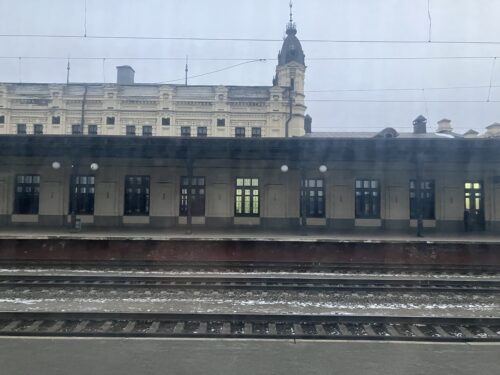 駅舎の二階のガスティニツァで泊まれるか聞いてみたが、休憩のみで宿泊はできないと言われる。そこでホテルを予約する必要が出てきたが、電波が通じないため、観光案内所でWi-fiに接続しホテルの予約とSIMを売っている店の場所を調べる。幸い駅前に「Київстар」のショップがあるようだ。