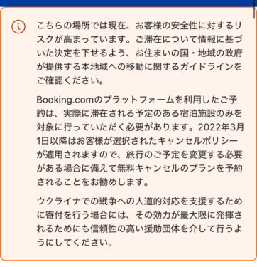 ホテルを予約しようとするとこのようなメッセージが来た。戦時中の国にいるんだということを改めて実感。