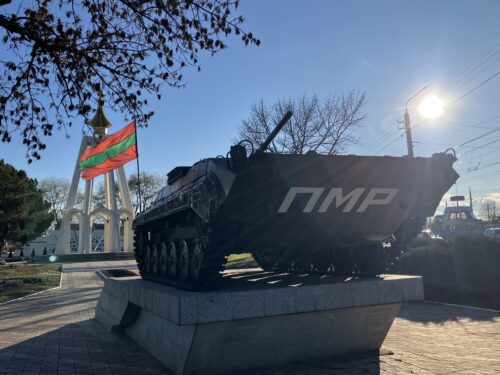ПМР(沿ドニの略称)と書かれた戦車が歩道に展示されていた。トランスニストリア戦争(沿ドニが事実上独立するきっかけとなった戦争)の勝利を記念するモニュメントだろうか。