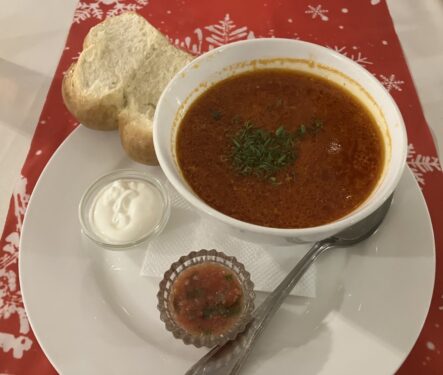 ボルシチ。今回の旅で食べた中で一番本格的で、味わい深く香り高かった。
