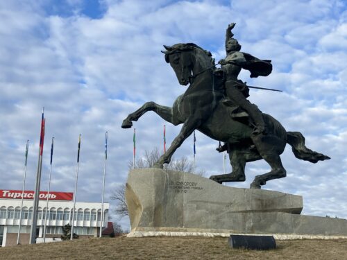 スヴォーロフ広場に堂々と立つアレクサンドル・スヴォーロフ像。数々の戦争を戦ったロシア帝国の名将で、露土戦争の際にオスマン帝国との国境を守る砦としてティラスポリを築いた(Wikipediaより)。
