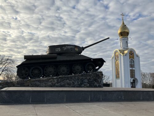大祖国戦争(独ソ戦)勝利を記念する、Tー34戦車と聖ジョージ勝利礼拝堂。戦車と礼拝堂という一見ミスマッチな組み合わせが良い。
