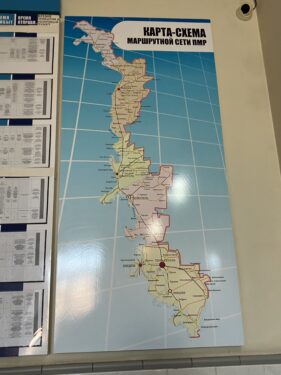 窓口の横にあった沿ドニの地図。今回行ったベンデル・ティラスポリは南の方にある2点で、沿ドニのほんの一部にすぎない。いつか必ず他のもっとマイナーな街にも行くことを誓った。